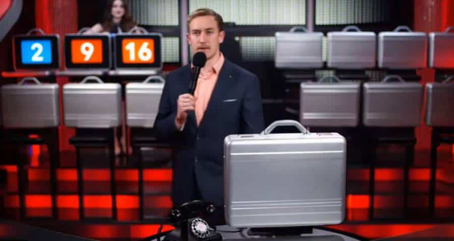 The contestant’s briefcase is on the table in the foreground, next to the game show host and the direct line to the banker.